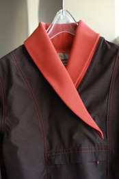 ステッチと同色になっている大振りなショールカラーはかなり特徴的ですが、そのデザインに対して短く設定された着丈がこの服の良い違和感を出している気がします