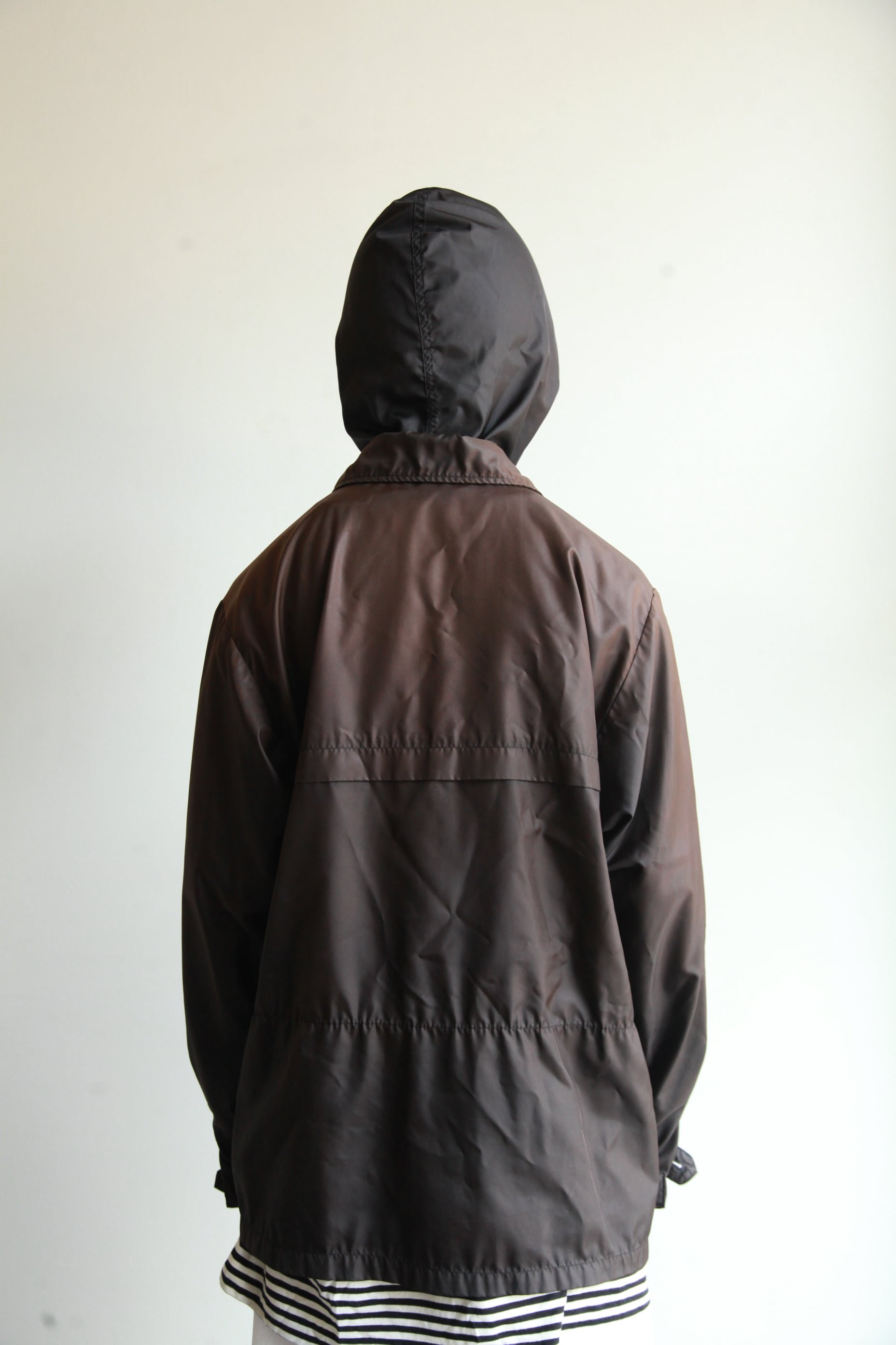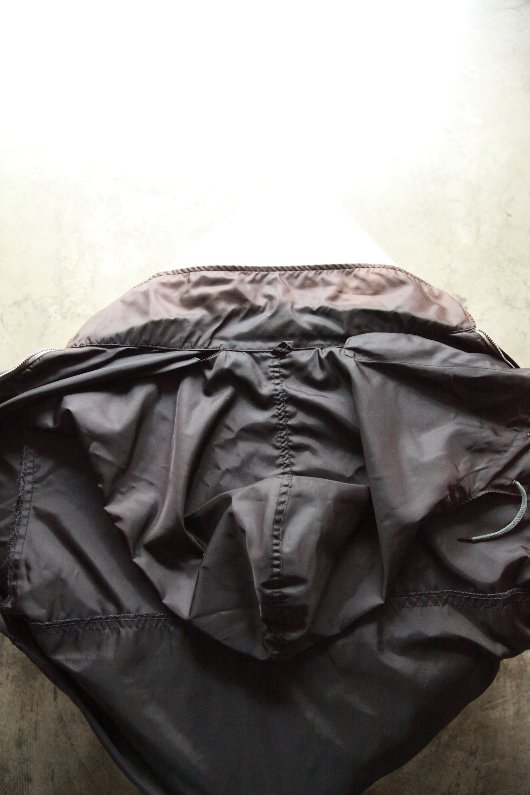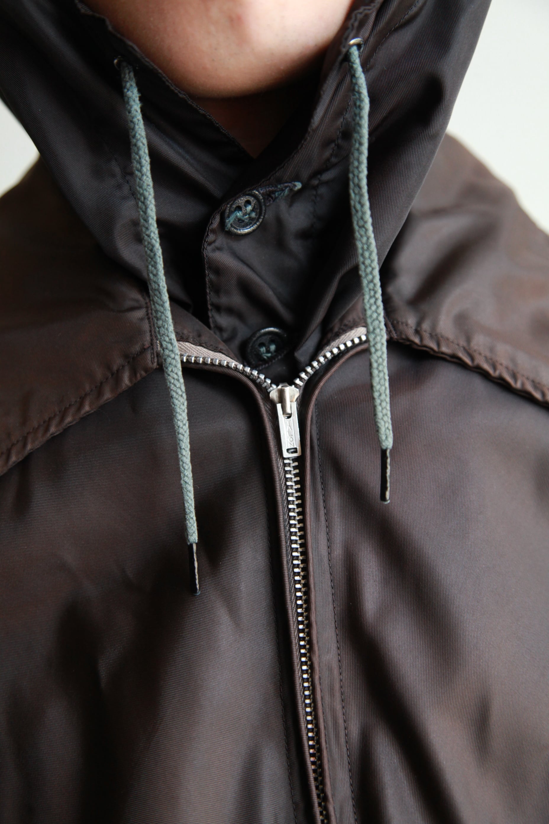 最近の服だとフードがスタンドカラーに収納されるタイプのものが多いですが、こちらは背中にしまうタイプのものなのでコーチジャケットのように着ることもできるし、内側の固定ボタンを使えばアワードジャケットの様に着ることもできます