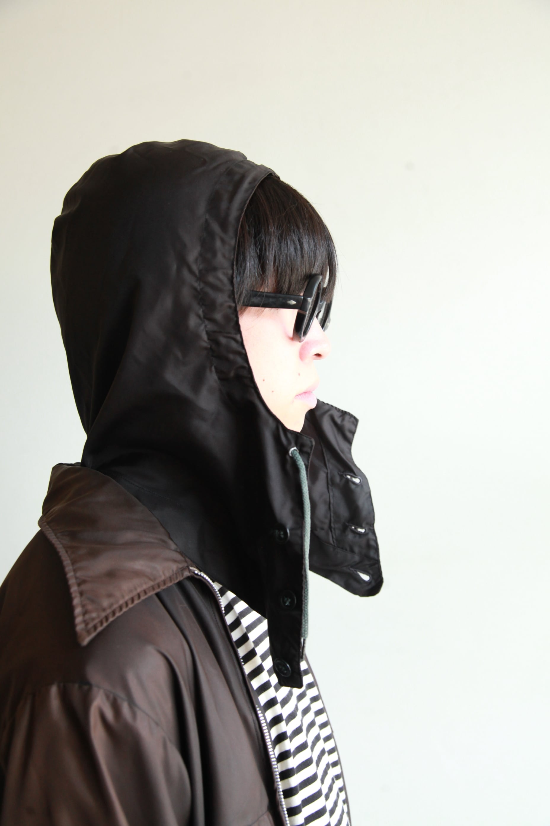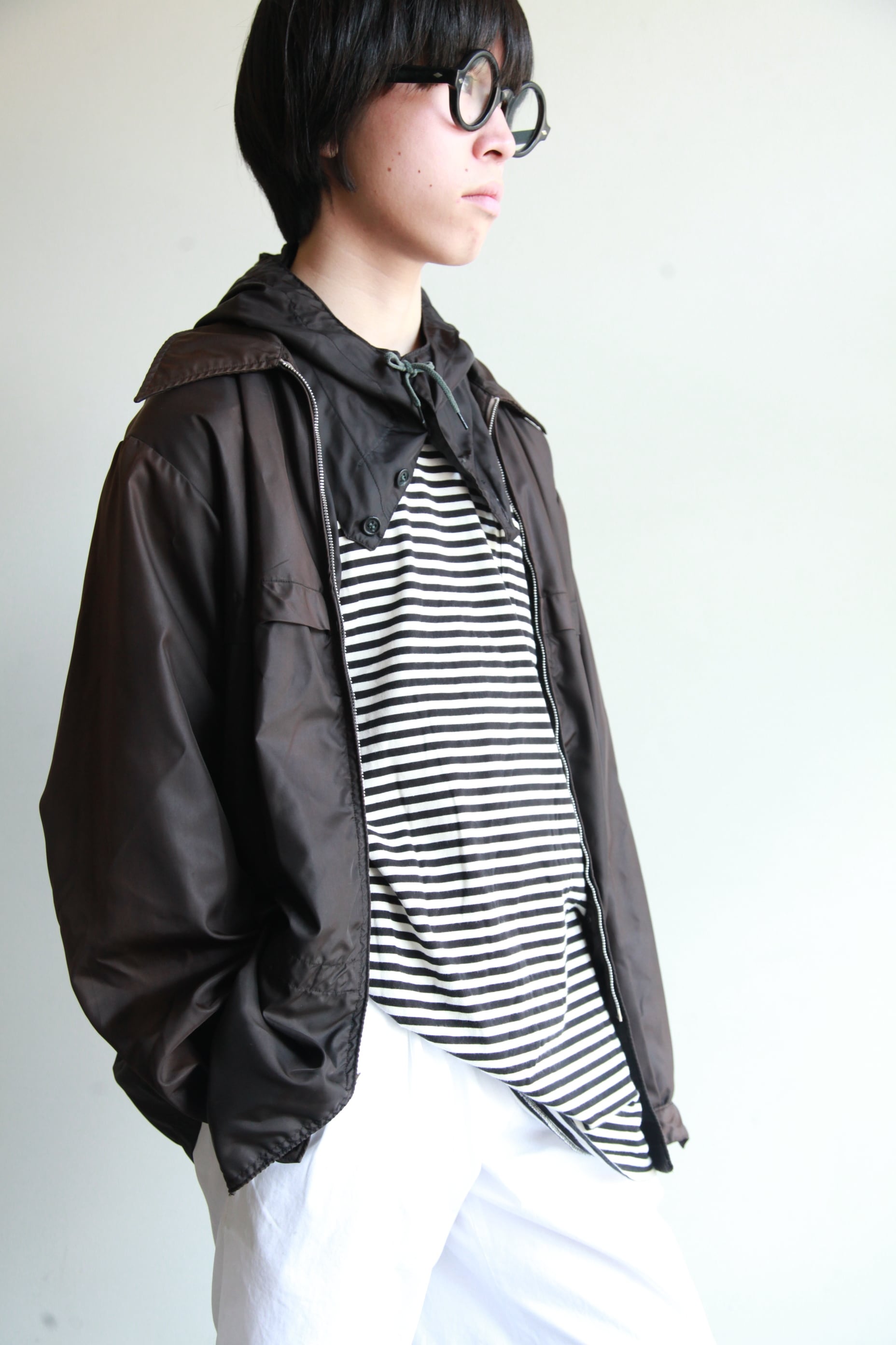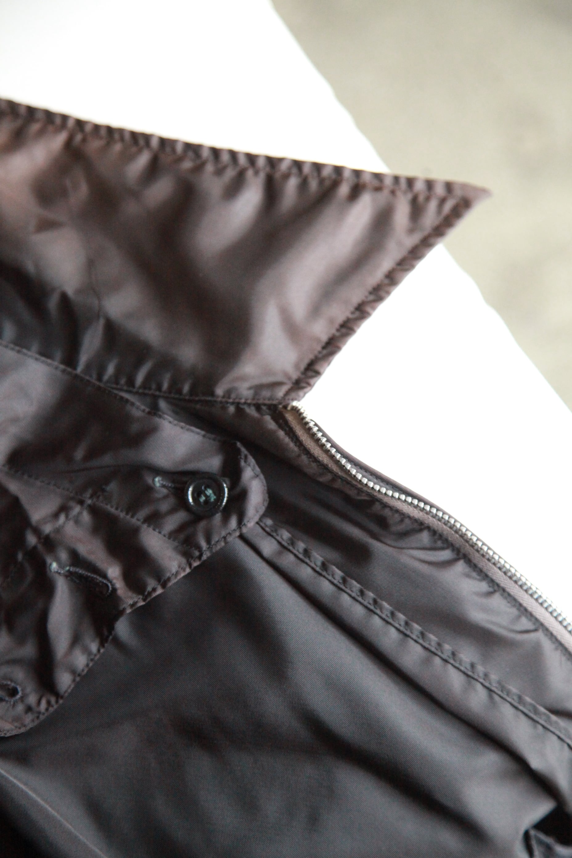 最近の服だとフードがスタンドカラーに収納されるタイプのものが多いですが、こちらは背中にしまうタイプのものなのでコーチジャケットのように着ることもできるし、内側の固定ボタンを使えばアワードジャケットの様に着ることもできます